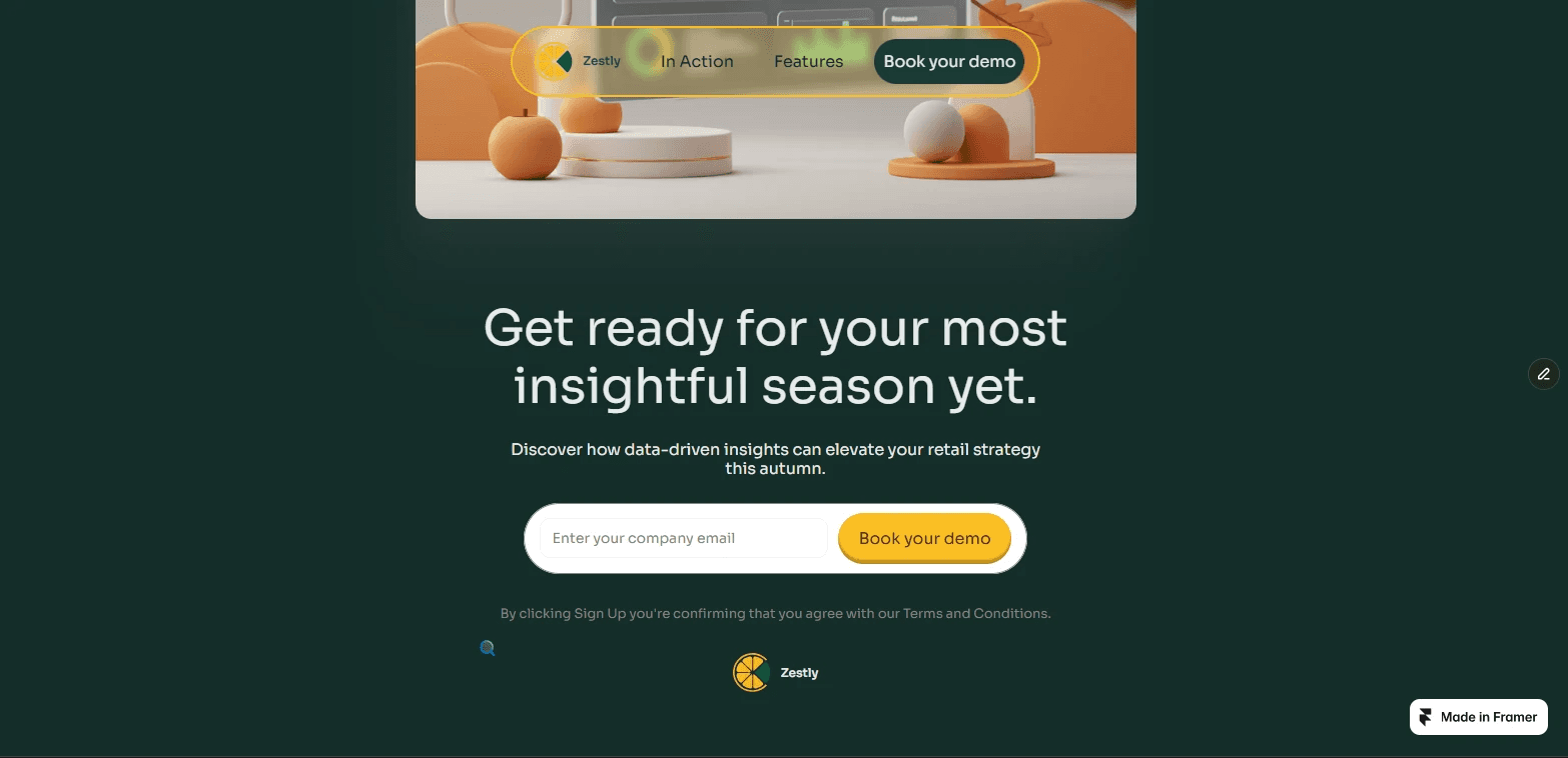 This project is a high-conversion landing page designed for Zestly, a fictional AI retail analytics platform, as part of a 72-hour design challenge. The page was created for the seasonal "Data Harvest" campaign, targeting retail decision-makers during their crucial pre-holiday planning period. The primary objective was to translate a complex service into a clear, compelling visual narrative that effectively communicates the product's value and guides users toward booking a product demo.